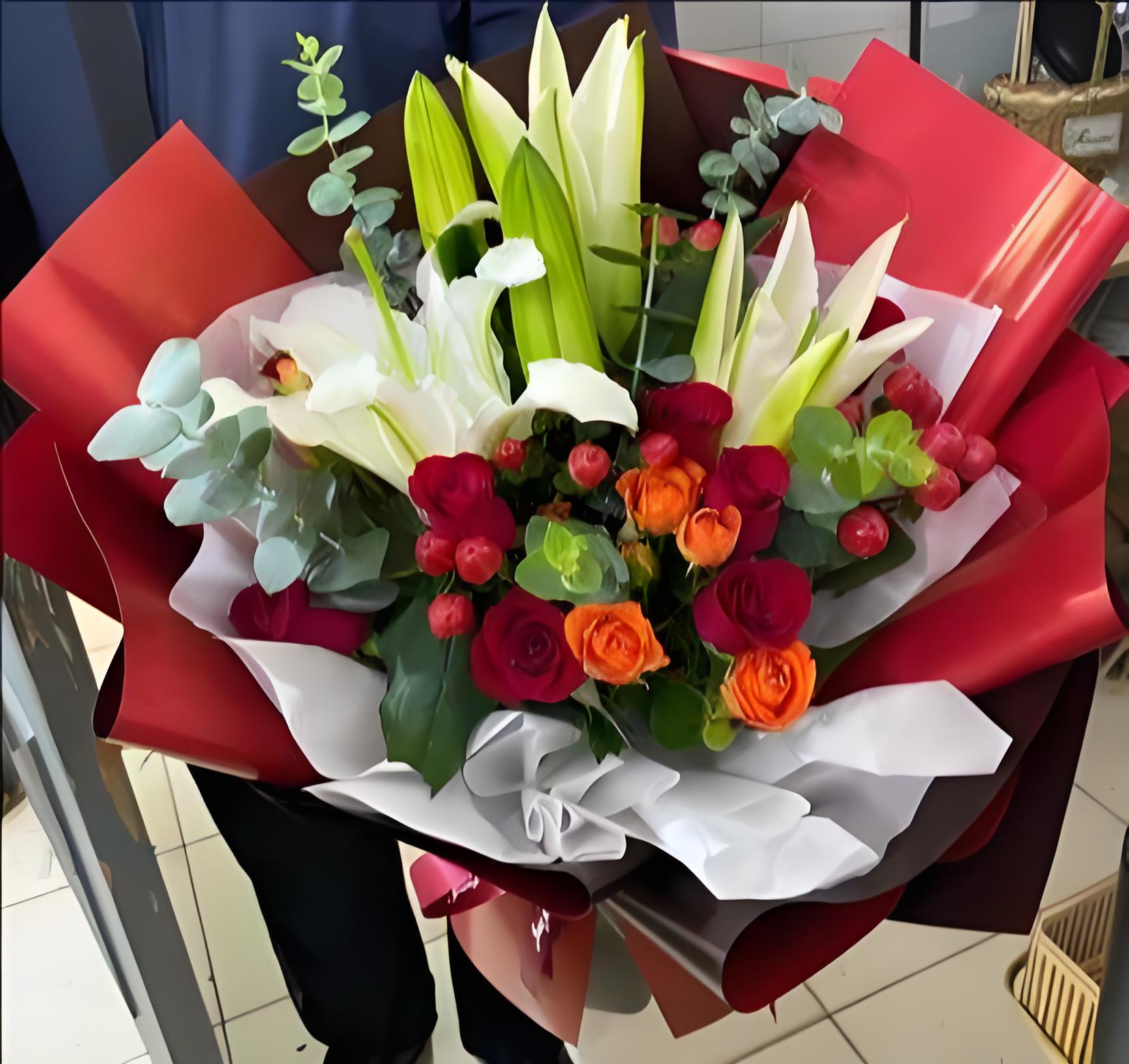 嘉兴南湖区花店包11枝红玫瑰、2枝多头白百合、6枝橙色多头玫瑰、红豆、尤加利叶